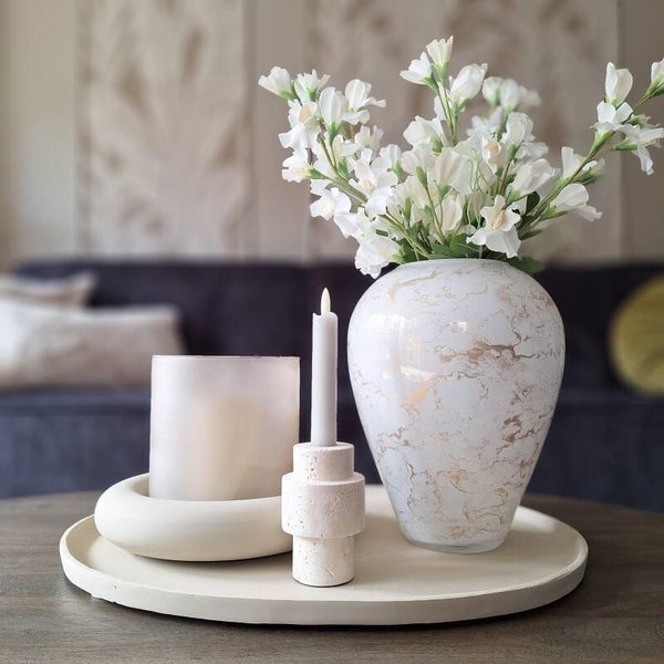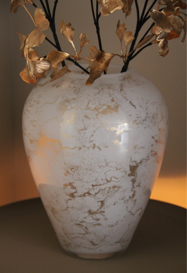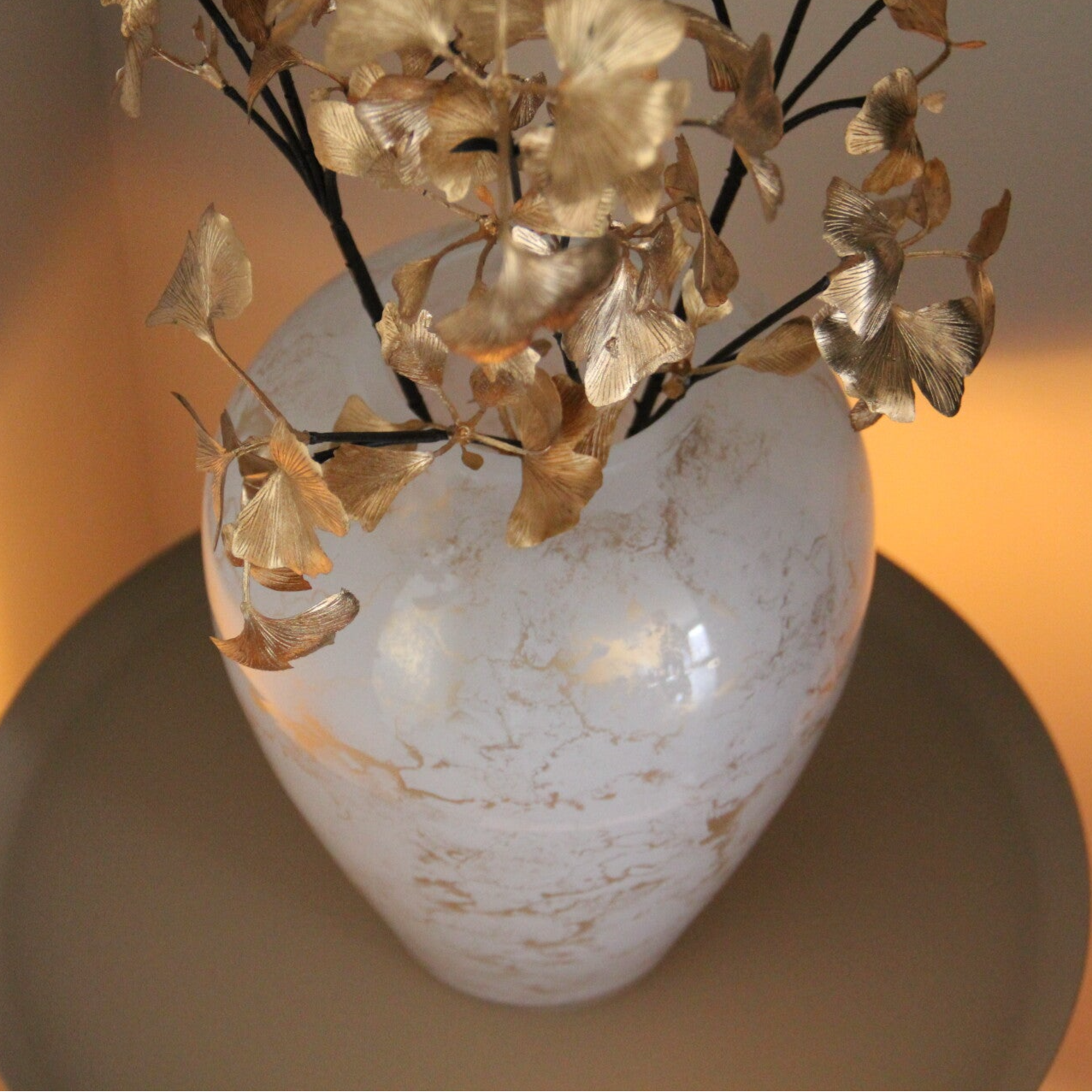 Vaas Christie is een elegante en chique vaas. Deze bijzondere grote vaas is met de hand gedecoreerd en gemaakt van glas. De marmeren vaas heeft een prachtige fijne gouden glitter en straalt pure luxe uit.