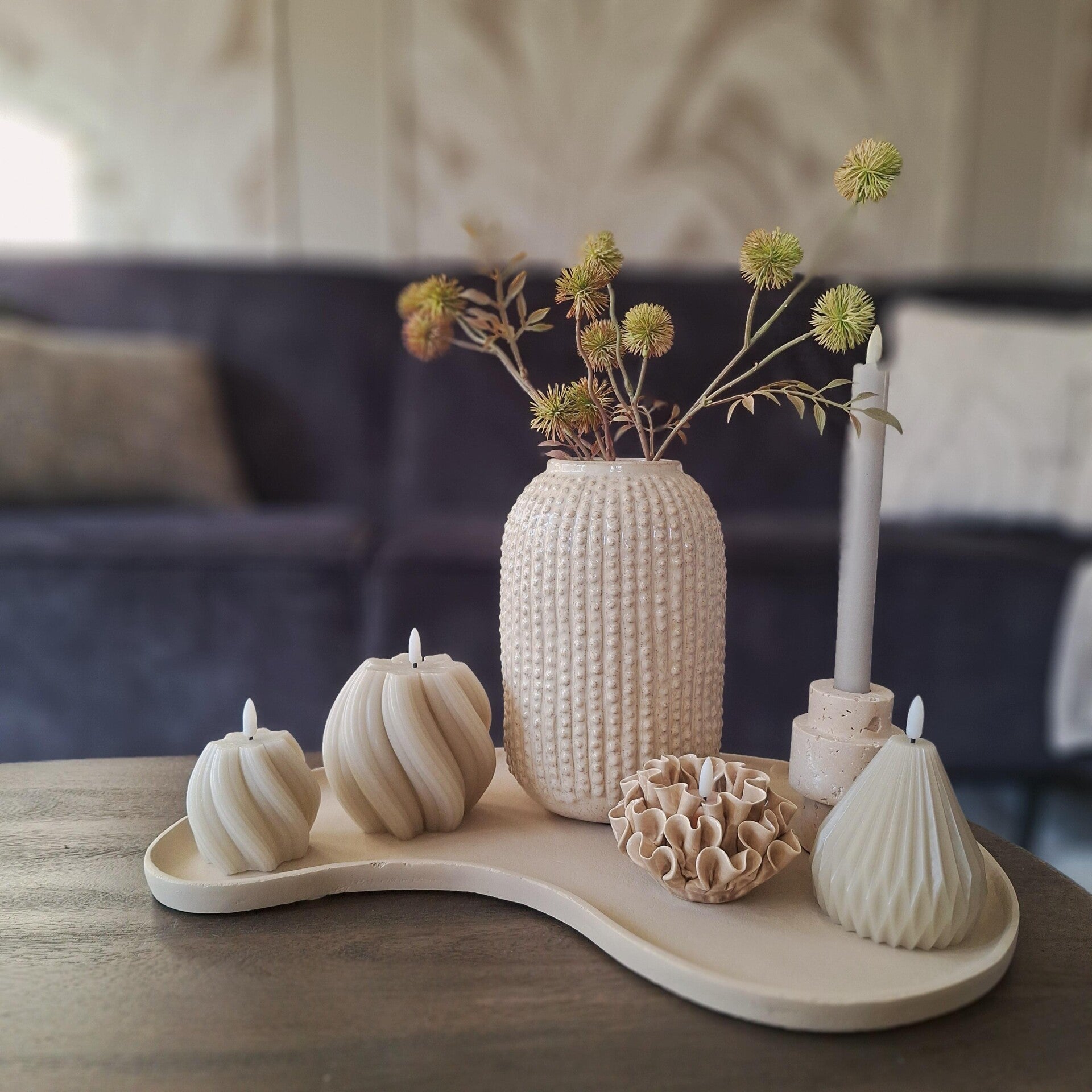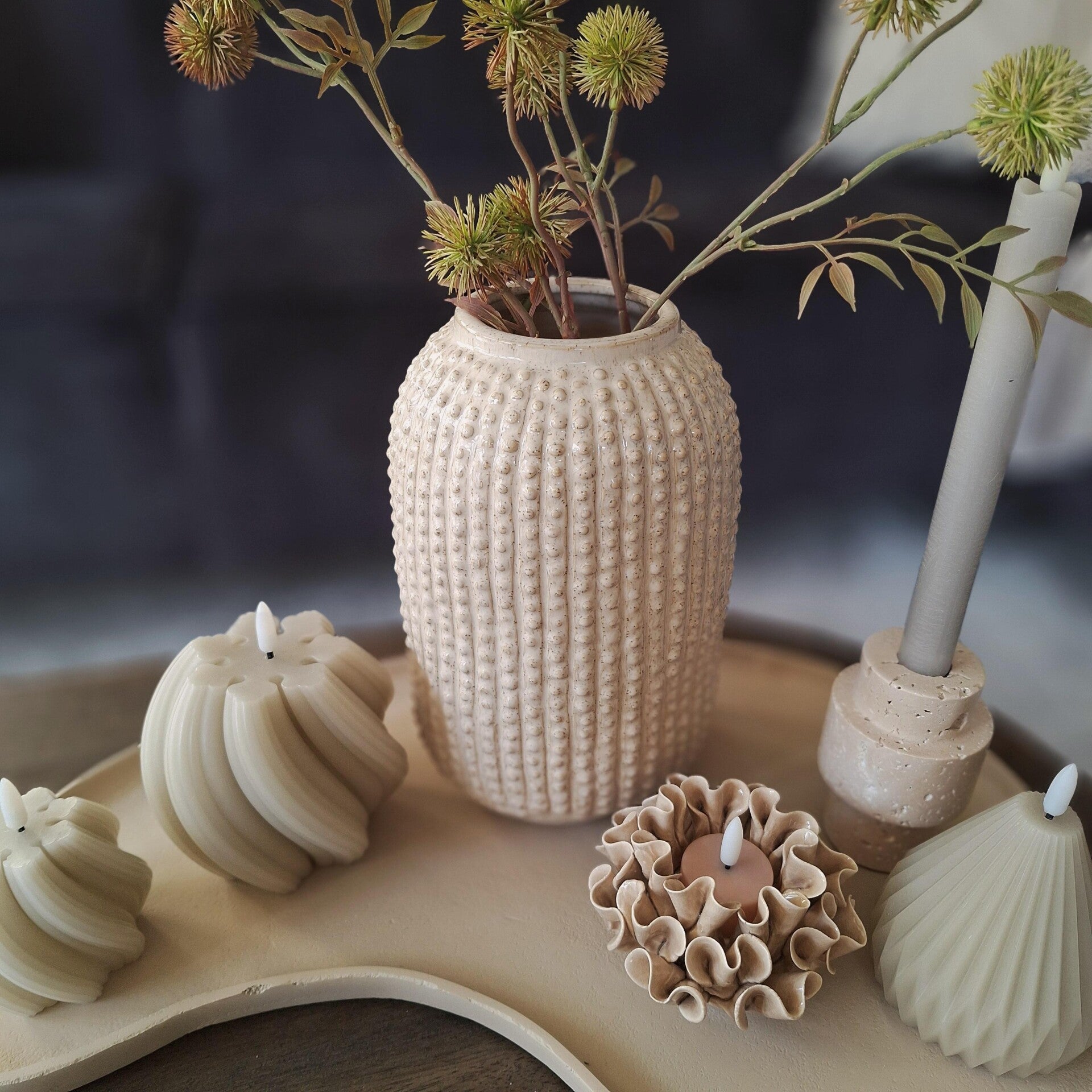 Deze beige vaas van keramiek is een echte must-have voor liefhebbers van stijlvolle woonaccessoires. Het unieke bolletjes design geeft de vaas een speelse en moderne uitstraling die perfect past in diverse interieurstijlen – van Scandinavisch tot boho of minimalistisch.