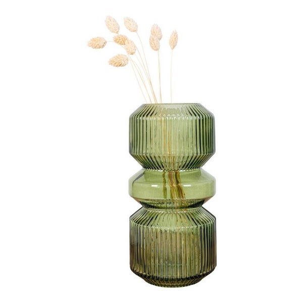 Hippe, groen getinte vaas van stevig, waterdicht glas met een moderne uitstraling. Dankzij het tijdloze ontwerp is hij eindeloos te combineren met verschillende interieurstijlen. De vaas vormt een echte eyecatcher op tafel of in een open kast. Style hem met een speelse droogtak, een enkele bloem of een rustig boeket voor een subtiel maar stijlvol accent.