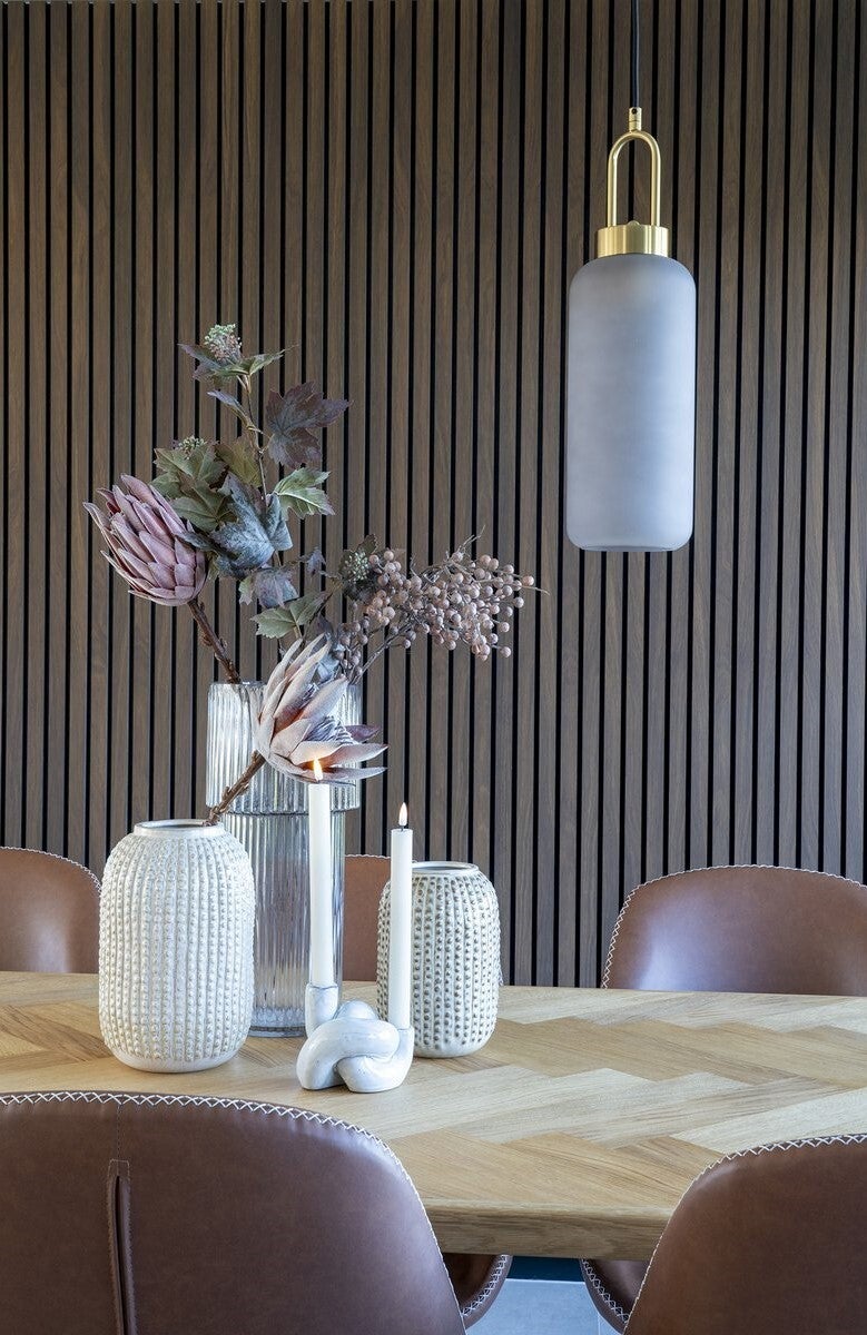 De kaarshouder heeft een unieke vorm en een prachtige structuur, waardoor hij niet alleen geschikt is voor kaarslicht, maar ook uitstekend dienstdoet als decoratief object op zichzelf. Zet hem op een dressoir, in een open kast of op een salontafel voor een subtiele, stijlvolle touch.