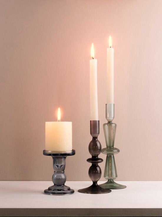 Deze leuke dinerkaarshouder heeft een speelse vorm en je kunt hem in elke interieurstijl combineren. De glazen kandelaar heeft een zachte grijze kleur en gecombineerd met andere kleuren en varianten ontstaat er een heel stijlvol effect! De kaarshouder is gemaakt van glas in een grijze kleur. In de houder passen dinerkaarsen.