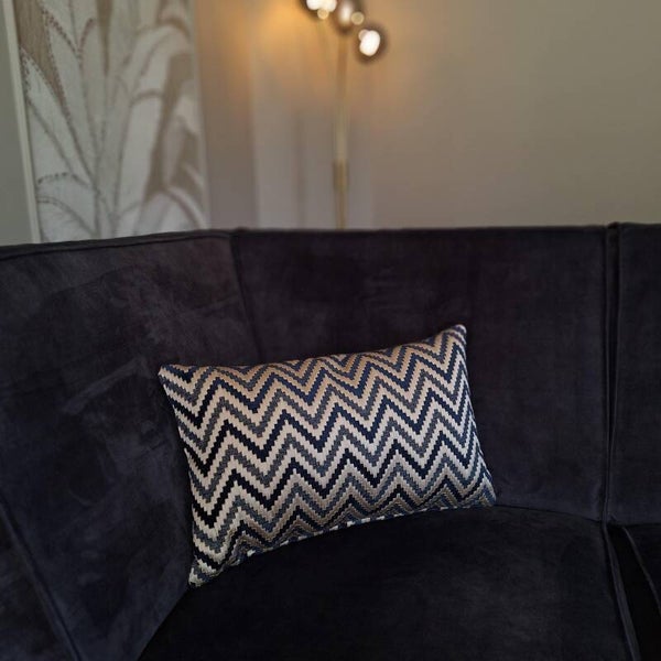 Dit omkeerbare, Zig Zag sierkussen van Colmore straalt design en luxe uit. De ene kant van het kussen heeft een champagne-achtige boventoon, waar de andere kant blauw meer de overtoom heeft. Zo geef je je interieur in één handomdraai een andere uitstraling. Hoe leuk!