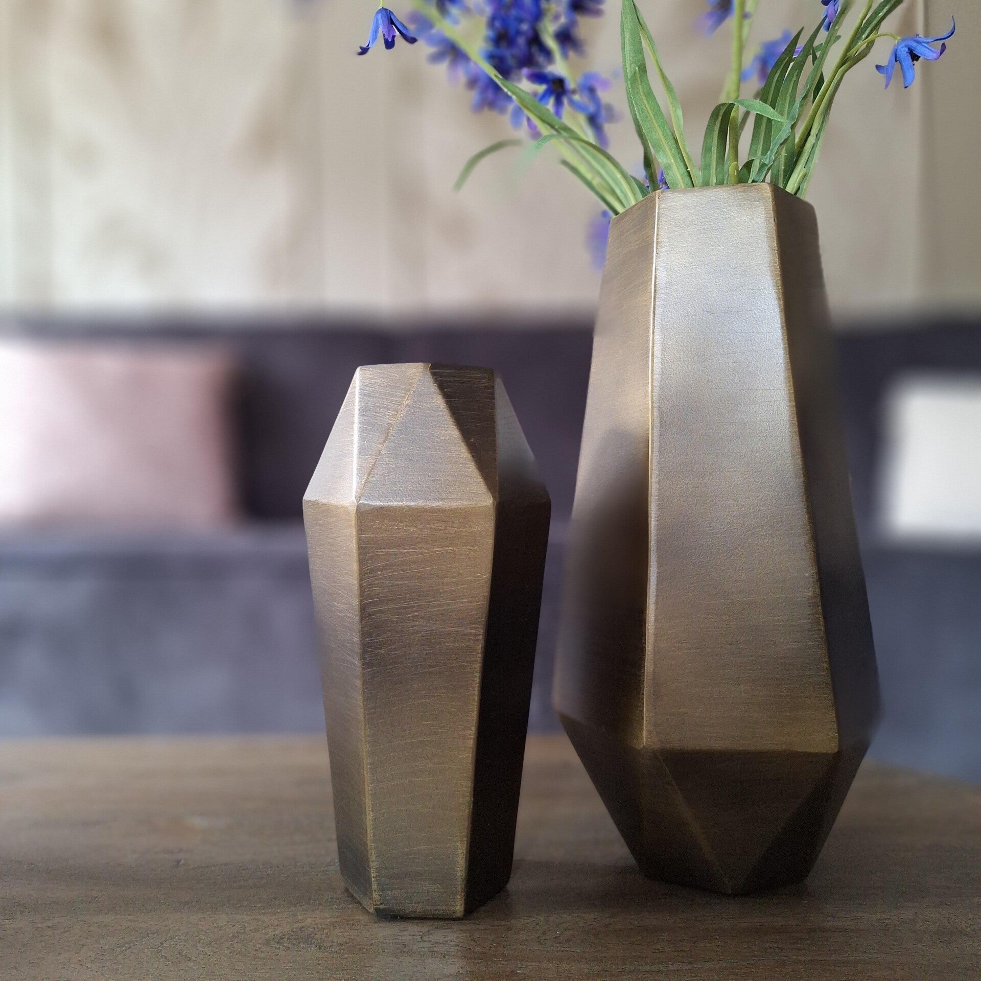 Deze bronzen vaas heeft een prachtig hexagon design waarmee hij luxe en elegantie uitstraalt. Laat je droogbloemen of takken stralen in deze luxe bronzen vaas!