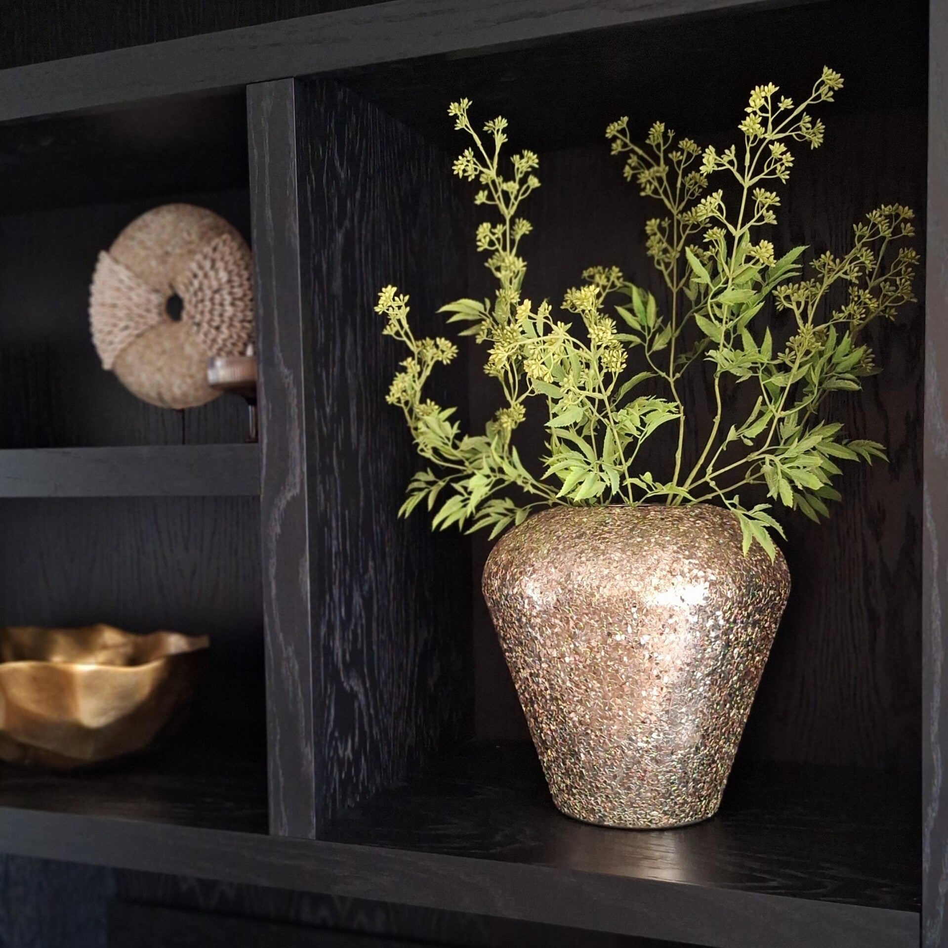 Met deze grote statement vaas, bedekt met kleine steentjes mozaïek, haal je absoluut een eyecatcher in huis! Vul hem in de herfst/winter met herfstkleurige bloemen of dennentakken. In de lente/zomer tover je de mozaïek vaas weer om met felle kleuren! Met deze champagne gouden vaas van Colmore kun je alle kanten op.