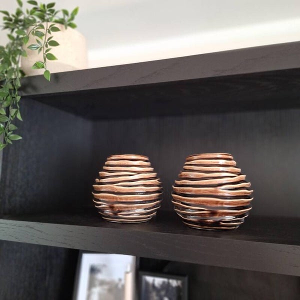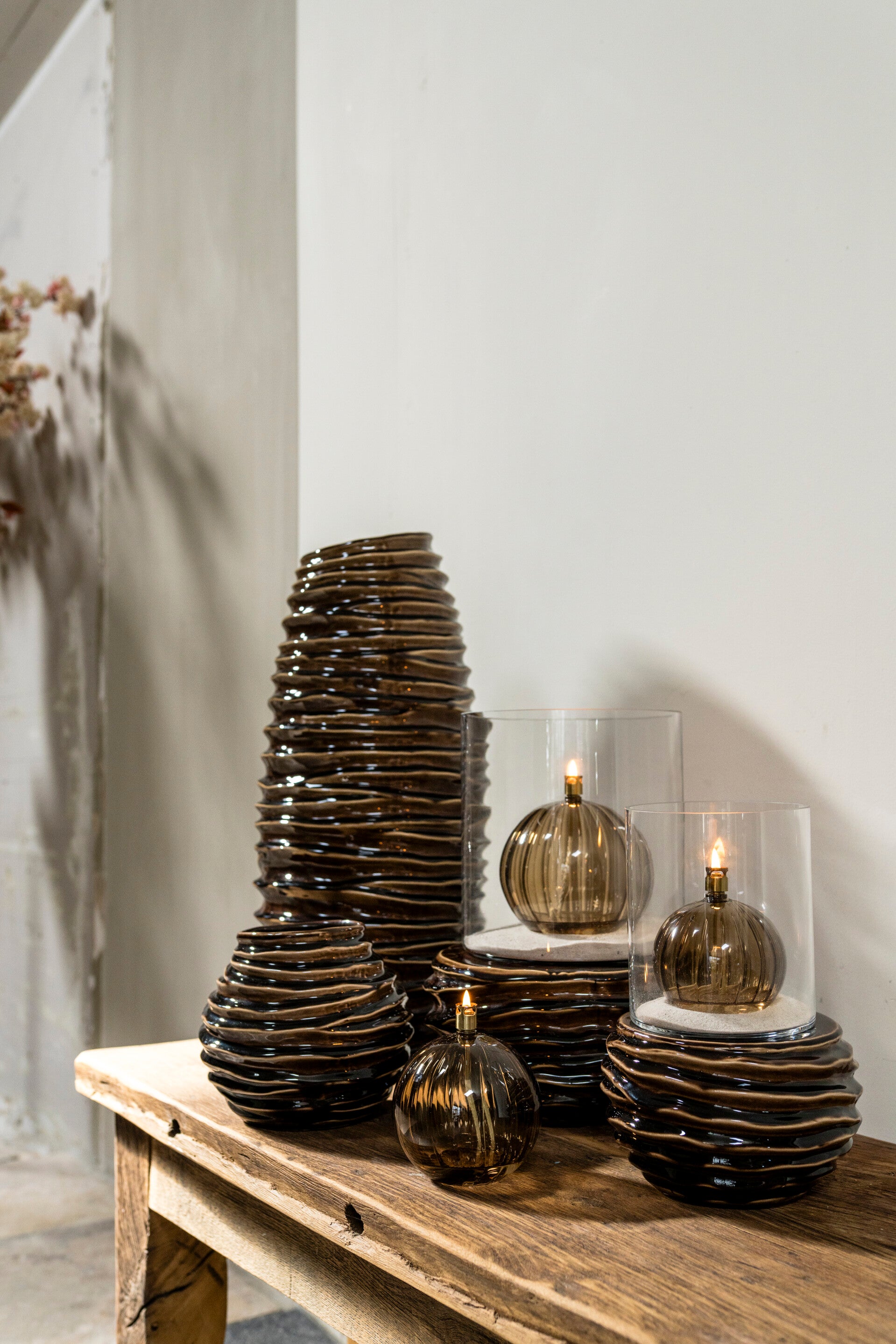 Luxe vaas Glow is een keramieken vaas met een uitgesproken ronde vorm en een glanzende, diepbruine afwerking. Het golvende lijnenspel geeft beweging en zachtheid, terwijl de compacte vorm deze exclusieve vaas perfect maakt voor lage bloemstukken of als los object in een open kast of op een salontafel.