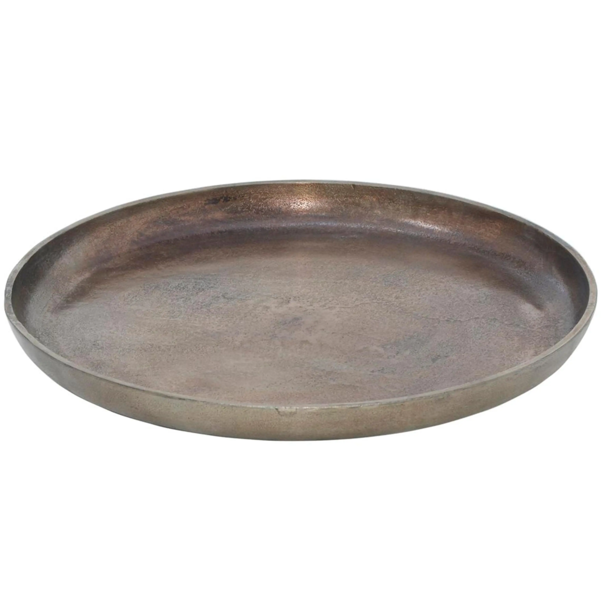 Hoogwaardig rond dienblad met opstaande rand in de kleur bruin/brons. Deze luxe schaal met rustieke afwerking heeft een diameter van 49 centimeter, waardoor je er gemakkelijk een grote vaas op kunt zetten met daarnaast nog wat mooie accessoires! De onderkant is voorzien van zachte viltjes. Zo kun je de bruine tray gemakkelijk verschuiven zonder de ondergrond te beschadigen.